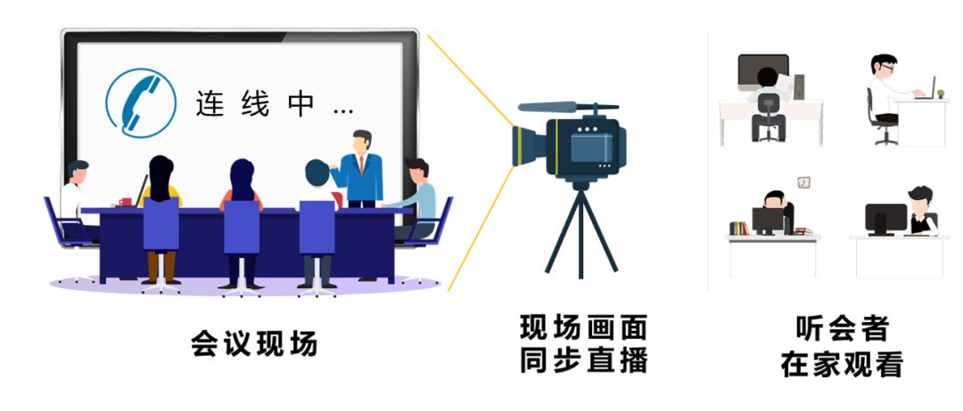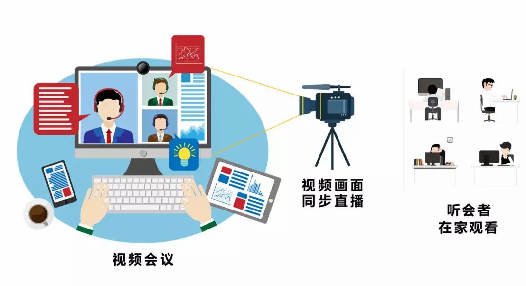 組織發(fā)言人通過視頻會議系統(tǒng)進行參會,并將視頻會議畫面進行同步直播,聽會人直接觀看直播即可。