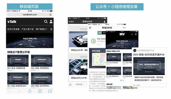 網(wǎng)瑞達vTalk平臺不僅為各類移動端均實現(xiàn)了優(yōu)化排版,頁面簡潔美觀,同時也支持小程序應(yīng)用。高校公眾號與小程序配合使用,使推廣與分享直播或錄播視頻更高效便捷。