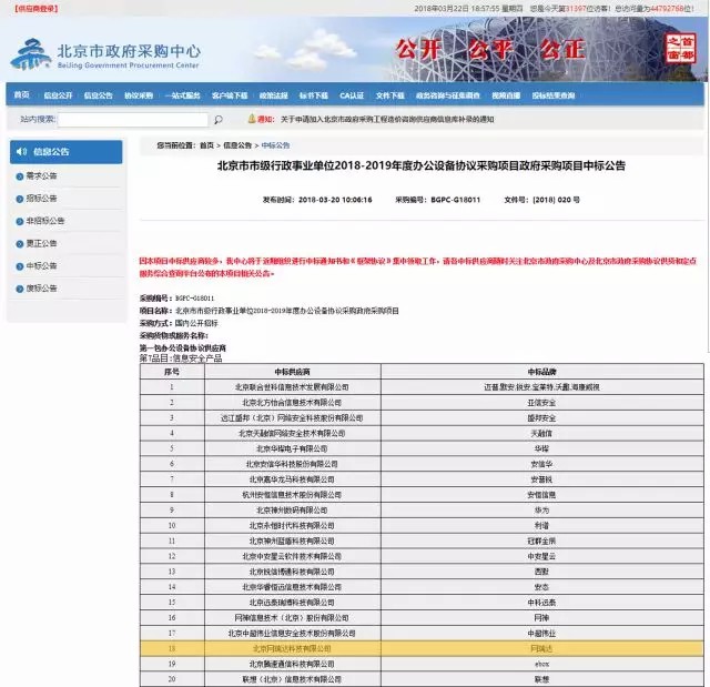 北京市市級行政事業(yè)單位2018年-2019年度辦公設備協(xié)議采購政府項目(BGPC-G18011)中,一共600多家企業(yè)參與了此次招標,網(wǎng)瑞達品牌及產品中標北京市政府采購項目并入圍其供應產品名錄。
