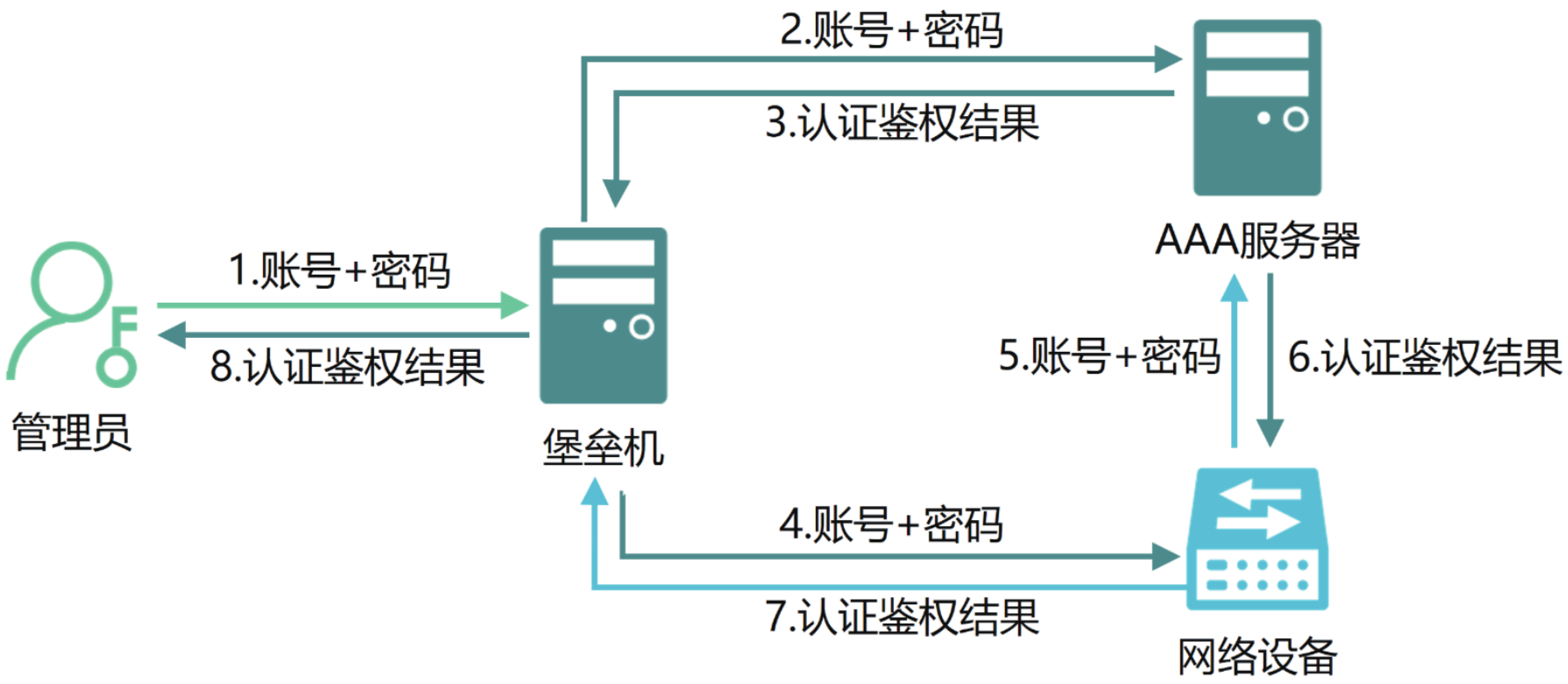 堡壘機(jī)與 AAA 服務(wù)器聯(lián)動(dòng),將堡壘機(jī)的認(rèn)證遷移到 AAA 服務(wù)器,管理員通過堡壘機(jī)訪問網(wǎng)絡(luò)設(shè)備。