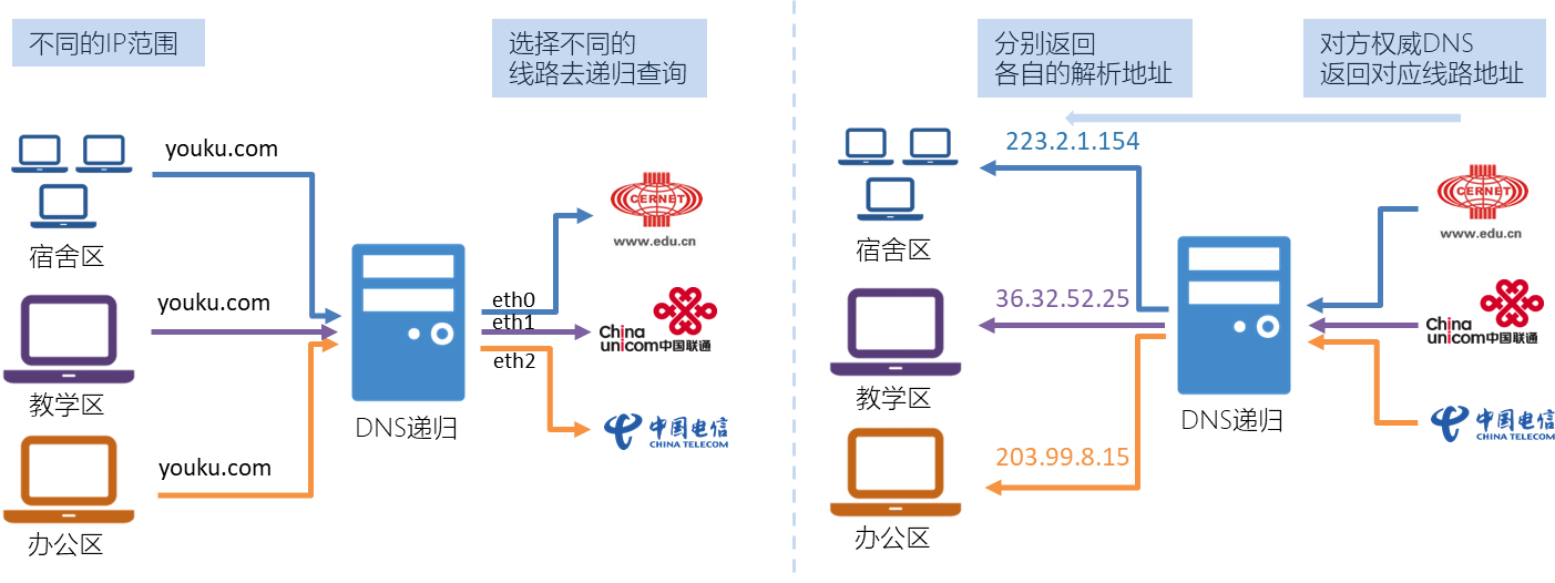 ·很多高校采用的是多運(yùn)營(yíng)商合作模式,支持用戶購(gòu)買不同運(yùn)營(yíng)商的帶寬,網(wǎng)瑞達(dá)智能DNS系統(tǒng)可以根據(jù)用戶選路的結(jié)果,將用戶的訪問(wèn)請(qǐng)求劃分到對(duì)應(yīng)的運(yùn)營(yíng)商線路。