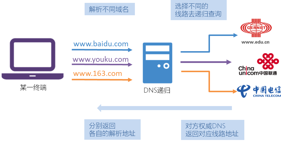 很多大型資源會(huì)在不同的線路上設(shè)置CDN節(jié)點(diǎn),例如優(yōu)酷為了提高用戶的訪問(wèn)速度,會(huì)在全國(guó)的不同地區(qū),在移動(dòng)、聯(lián)通、電信等不同線路上設(shè)置CDN節(jié)點(diǎn)?;谠撉疤釛l件,網(wǎng)瑞達(dá)提供了一套DNS層面的客戶端流量調(diào)度解決方案,配合網(wǎng)絡(luò)層的路由策略可以實(shí)現(xiàn)更多的流量調(diào)度方式。
