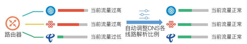 ·智能DNS系統(tǒng)能夠檢測(cè)各鏈路的當(dāng)前流量,根據(jù)流量智能調(diào)整各個(gè)鏈路上的請(qǐng)求數(shù),避免擁塞,優(yōu)化訪問(wèn)體驗(yàn)。